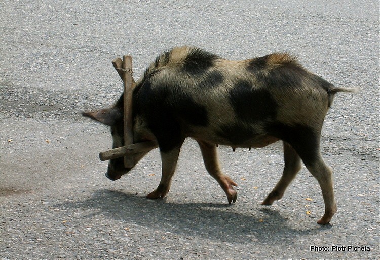 „Och, właśnie te swaneckie świnie! Podobne są do wszystkiego, tylko nie do świń. To dzikie świnie, spłaszczone z boków jak ryby. Czarne albo łaciate, chude, ze stojącą na karku szczeciną, przypominającą hieny ze świńskim ryjem o nogach antylopy. Wiele Staneckich świń zdobywa sobie pożywienie samodzielnie w lesie i wokół osiedli. Żeby zabić taką półzdziczałą świnię, trzeba na nią polować z nożem, a nieraz i strzelać”.