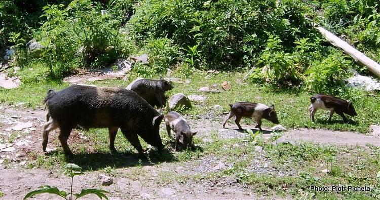 „Dzik jest dziki, dzik jest zły. Dzik ma bardzo ostre kły. Kto spotyka w Gruzji dzika, ten na skałę szybko zmyka. Dzik jest dziki, dzik jest zły, dzik ma ku..a ostre kły” ale ten, o dziwo, jakoś taki niepozorny. Niby wszystko się zgadza: „ssak o krępej budowie (…) na krótkiej, grubej i muskularnej szyi osadzony klinowaty łeb o małej mózgowioczaszcze i dużej trzewioczaszce – ja pierdziele, co to znaczy – (…) stojące uszy, w kształcie trójkąta, gęsta szczecina, ubarwienie zmienne, latem ciemniejsze, może przechodzić od niemal czarnego, przez brązowo czerwone po płowe”. Dzik jest dzikiem, i warchlaki rzędem. Locha podobno zaciekle broni młodych. Tylko ona jakaś taka nijaka, nie za duża. Yhm, no zdecydowanie nijaka taka – sparafrazowałem cytat z filmu.